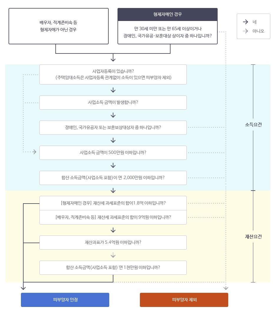 조건 없음 | 부모, 배우자 소득 없을 경우 형제 / 자매가 없거나, 있을 경우 소득 없음 |