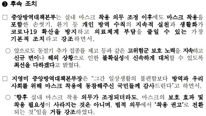 중앙방역본부에서는 “그간 일상생활의 불편함보다 방역과 우리 사회를 위해 마스크 착용에 동참해 주신 국민들께 감사드린다”라고 하면서, “향후 실내 마스크 착용 의무가 조정되더라도, 마스크의 보호 효과 및 착용 필요성이 사라지는 것은 아니며, 법적 의무에서 ‘착용 권고’로 전환되는 것”임을 거듭 강조하였다.