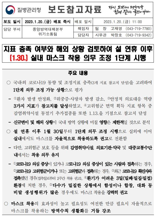 이는 질병관리청에서 실내 마스크 착용 의무 조정 검토 및 향후 계획에 따라 중앙방역대책본부에서 7차 유행이 정점을 지나 지표를 제시한 취지를 충족하였다고 판단, 의무 조정 1단계 추진계획을 발표했습니다.