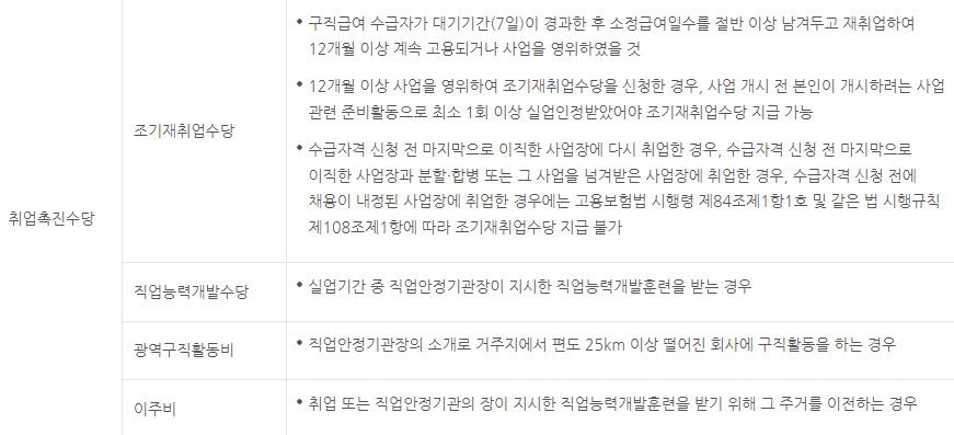 - 구직급여 수급자가 소정급여일수 절반 이상 남겨두고 재취업하여 1년(12개월) 이상 고용된 경우