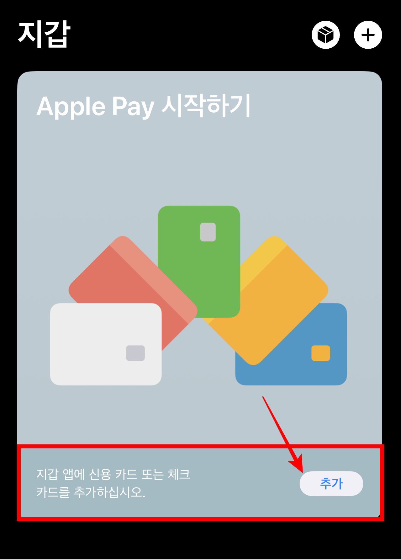 - 지갑 앱 실행, 어플 중앙 애플페이 시작 추가 / 우측 상단 "+" 추가 확인