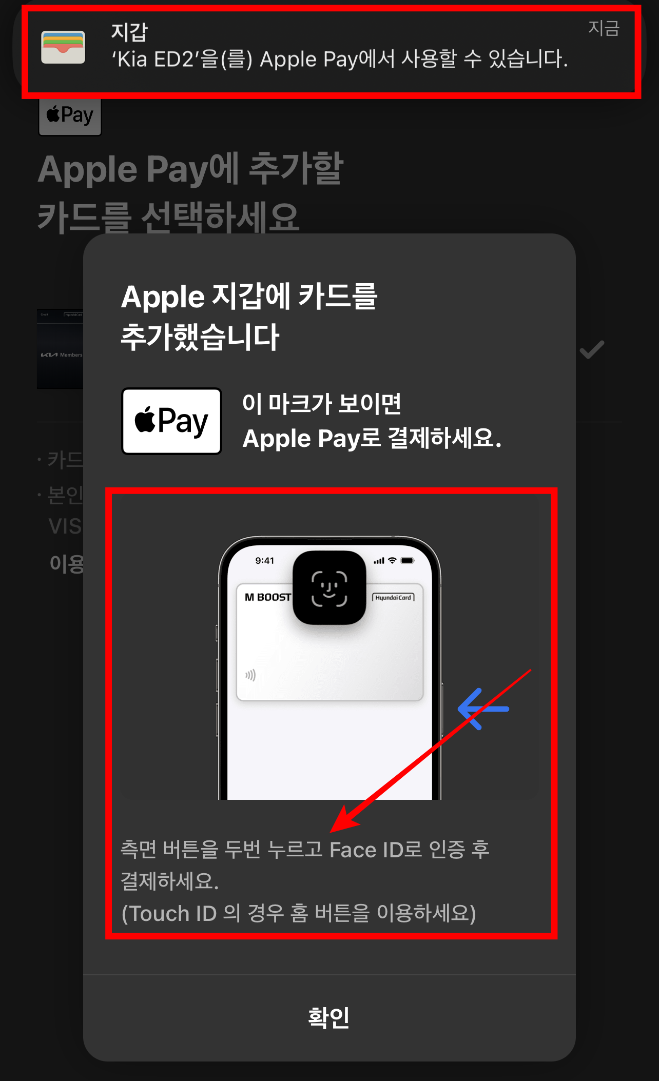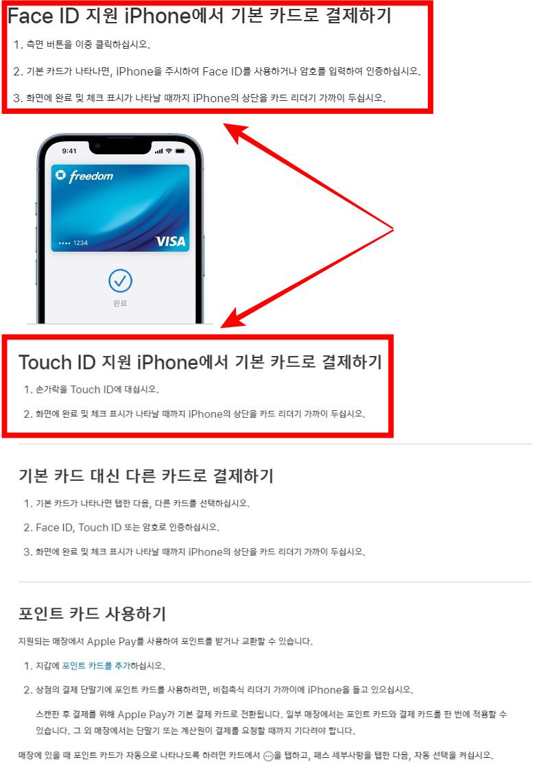애플페이는 아이폰의 "측면 버튼을 두 번 누르시면, Face ID 또는 비밀번호 인증 후 결제"하는 형식입니다. 추가적으로 Face ID가 사용 불가능한 Touch ID 지원 아이폰은 지문인식, 비밀번호 인증 후 결제입니다.