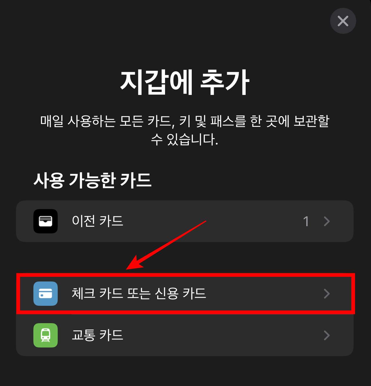 2. 지갑 추가 항목에서 "체크카드 또는 신용카드" 항목 선택