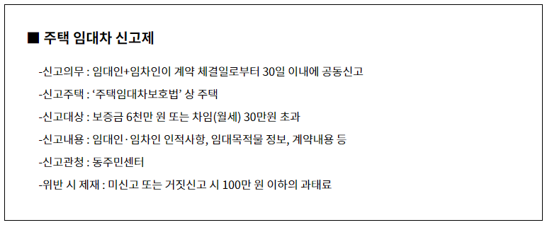 전월세 신고제 "주택 임대차 계약 신고제"란, 주택 임대차 계약 체결일로부터 30일 이내에 계약 당사자가 임대기간, 임대료 등 계약 주요 내용을 신고하도록 의무화한 것을 말하며, 계약서만 갖고 있으면 임대차 신고로 확정일자까지 부여가 가능합니다.